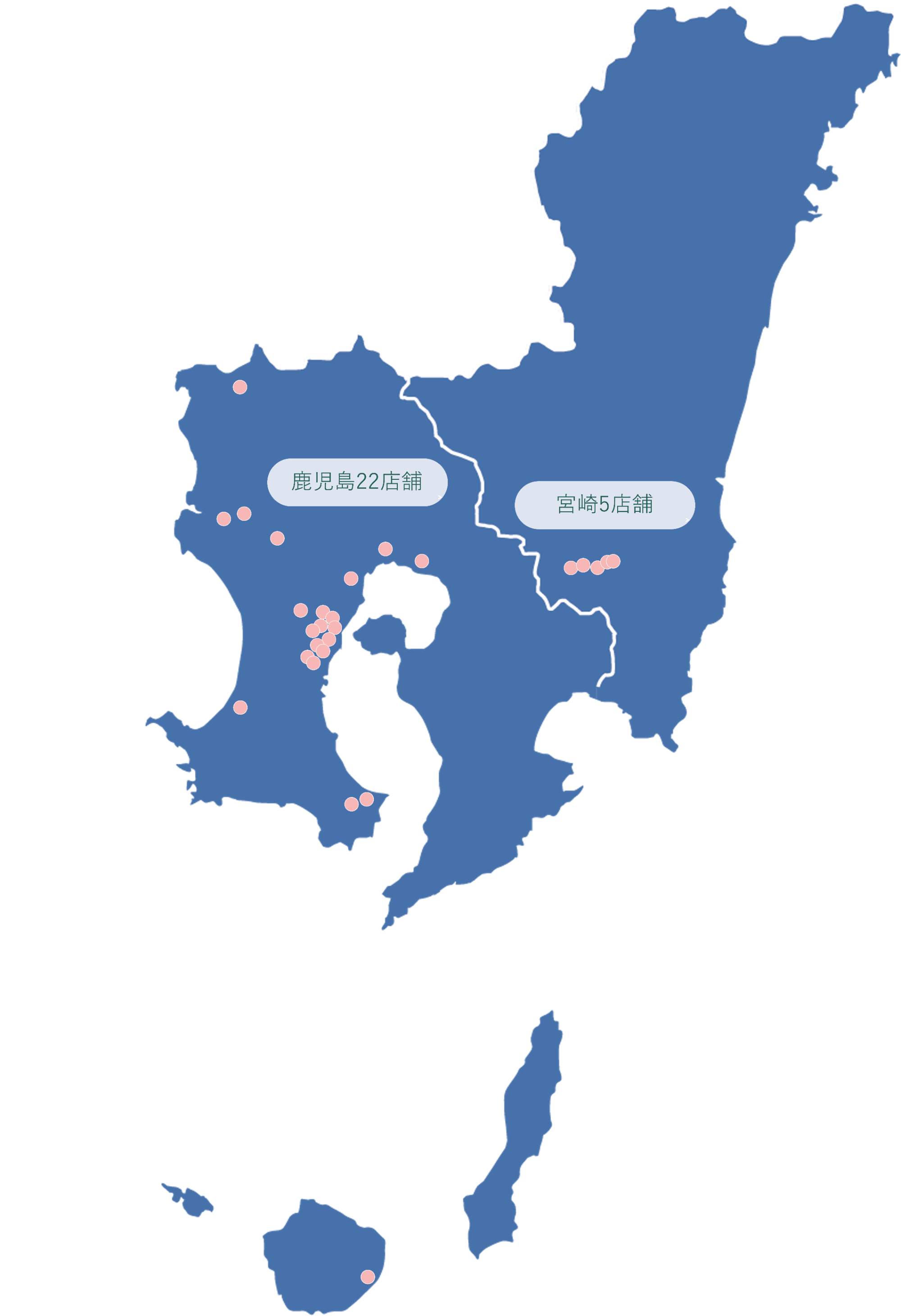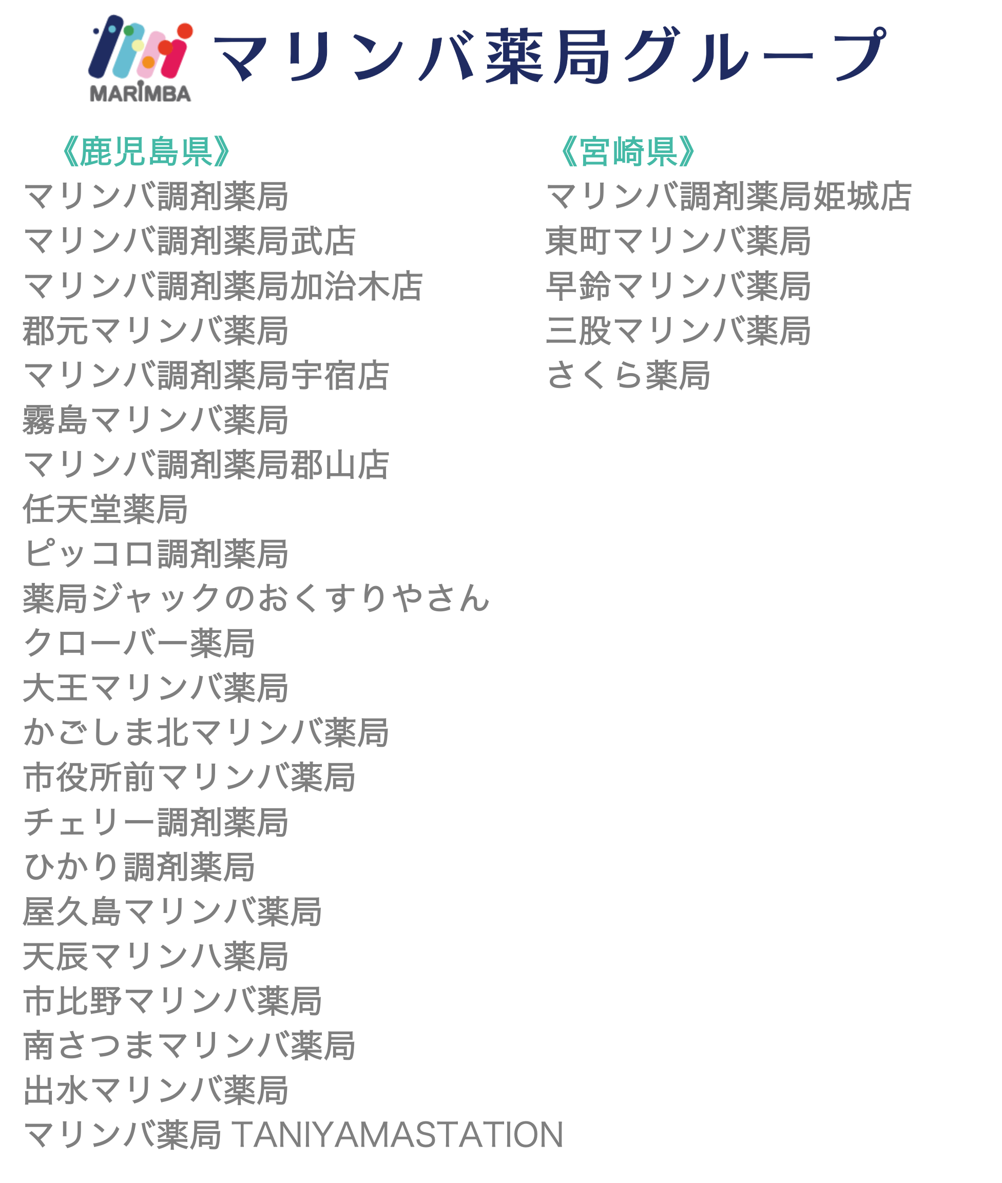 サティスファーマは、マリンバ薬局グループ27店舗(鹿児島22店舗、宮崎5店舗)を展開しています。