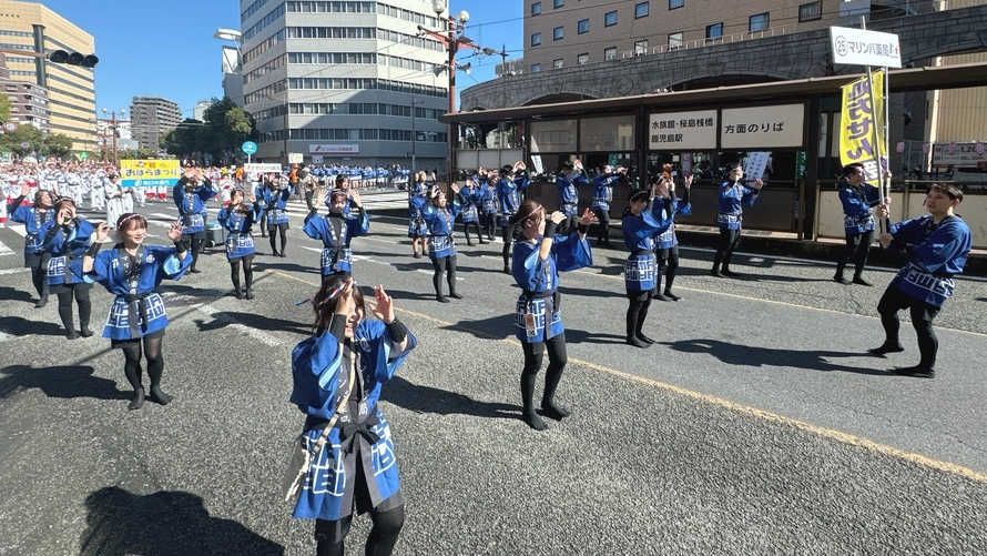 南九州最大の祭イベント「おはら祭」に参加しました!エントリーも今年で8年目を数えるチーム・マリンバ。ねじり鉢巻で張り切って参加します。